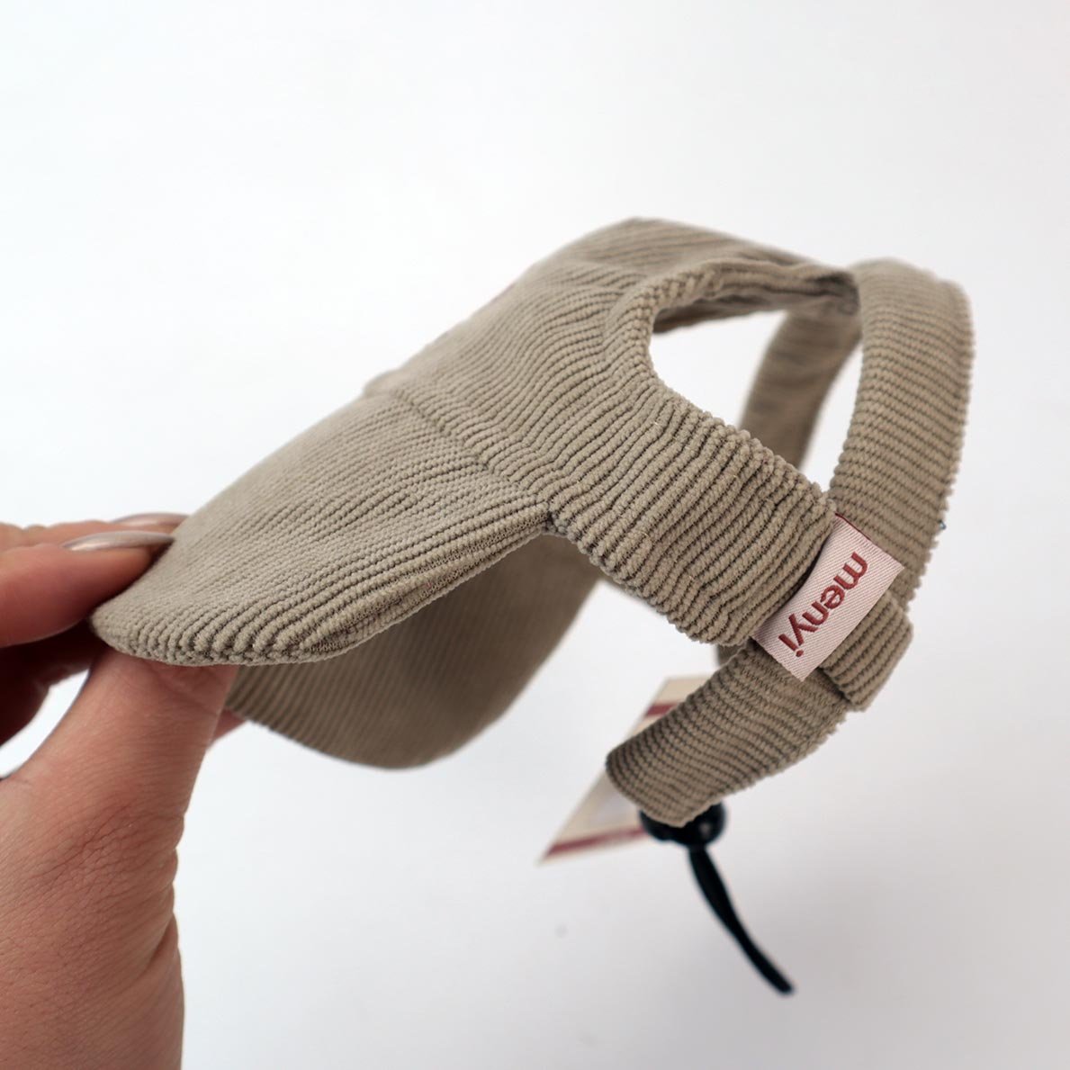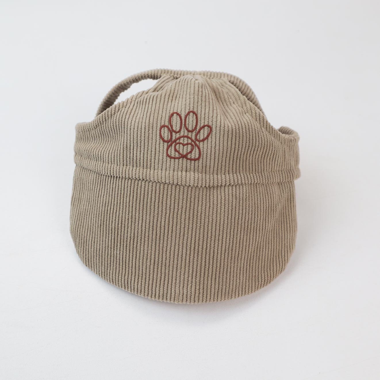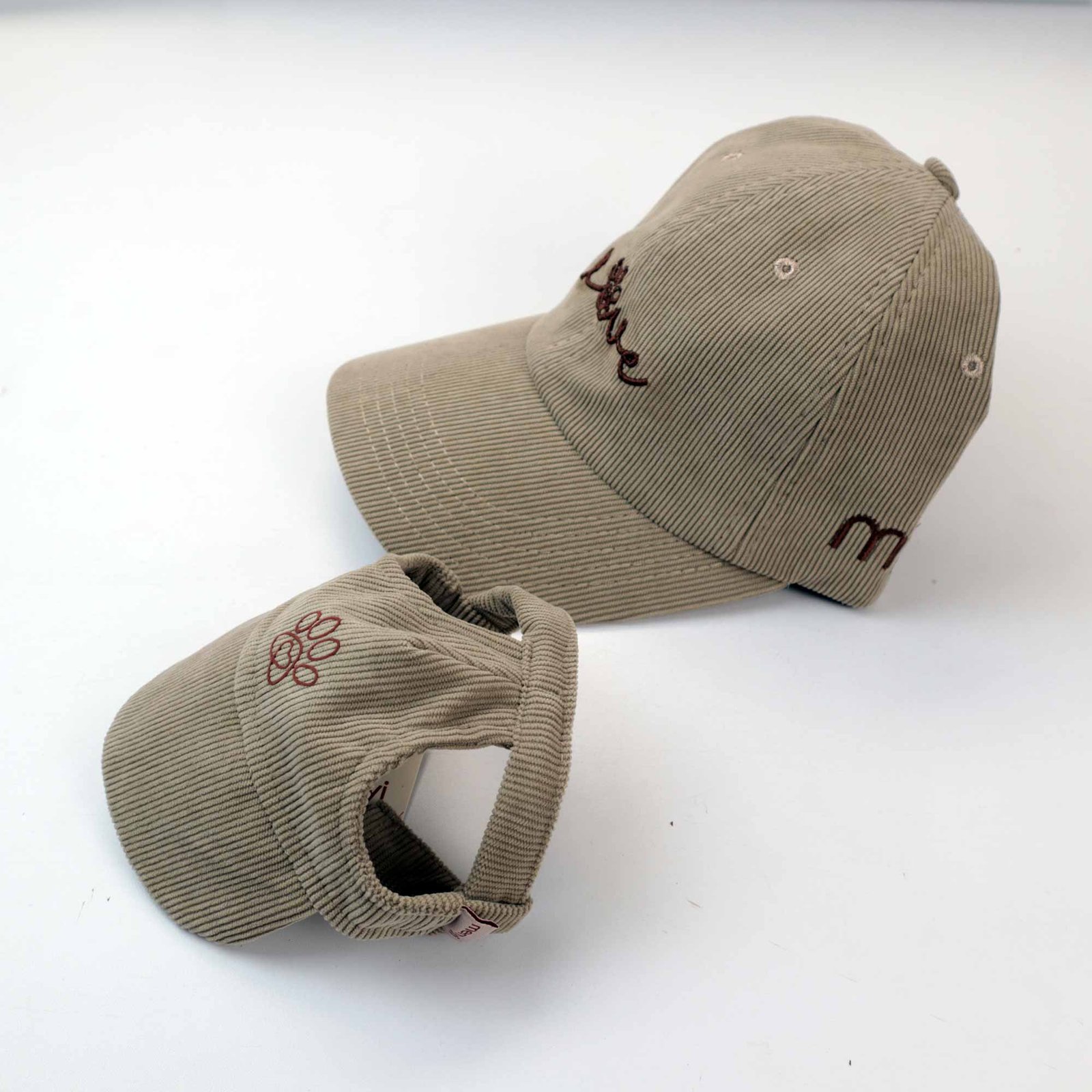 Gorra en pana color beage para mascota, con aguste y tanca para graduar, personalizada Love en vinilo gamusa, producto 100% hecho en Colombia.